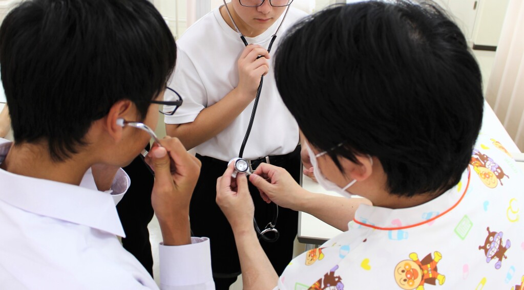 手洗いの後は、聴診器の使い方、呼吸音・心音の聴取部位を学び、お互いの身体の音を聴きました。