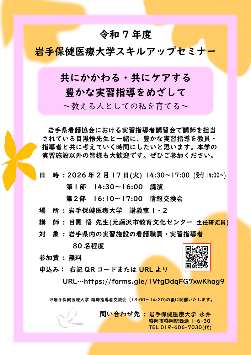 このセミナーは、岩手県内の看護教員と実習施設の看護職員・実習指導者を対象に、実習指導をより充実するための連携・協働をめざして、岩手県看護協会における実習指導者講習会で講師を担当されている目黒悟先生と一緒に、豊かな実習指導を教員・指導者と共に考えていく時間にしたいと思います。